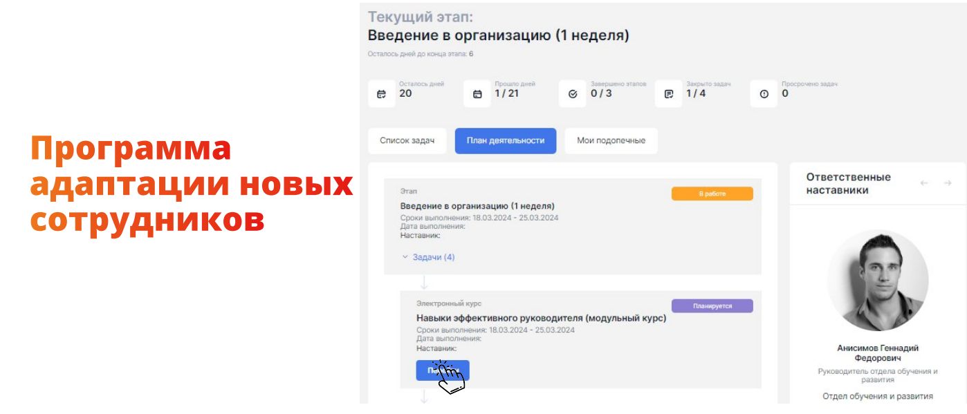 - Интерфейсы для работы новых сотрудников, наставников и руководителей