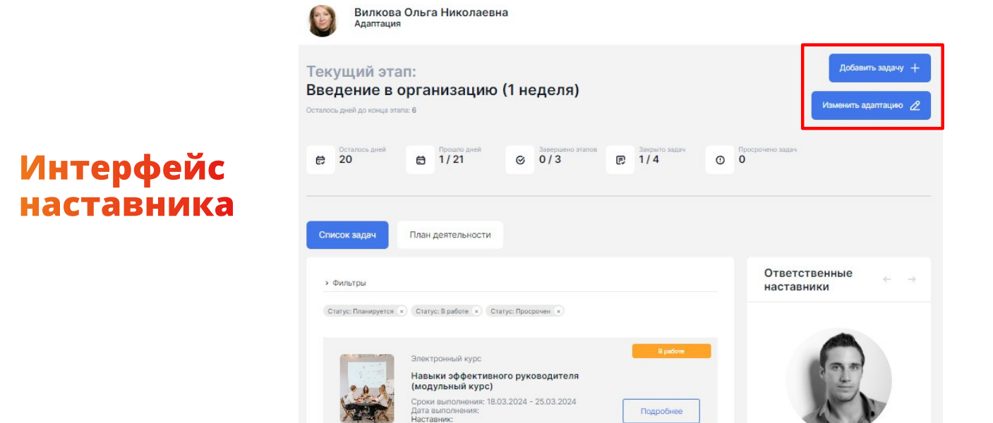 - Наставник может в целом управлять адаптацией. Какую-то задачу он может отменить, может проставить статусы по задачам, может поставить оценку сотруднику.
