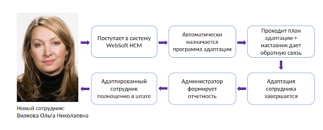 Так выглядят этапы адаптации в коробочном решении Websoft HCM, на всех этих этапах возможна автоматизация.