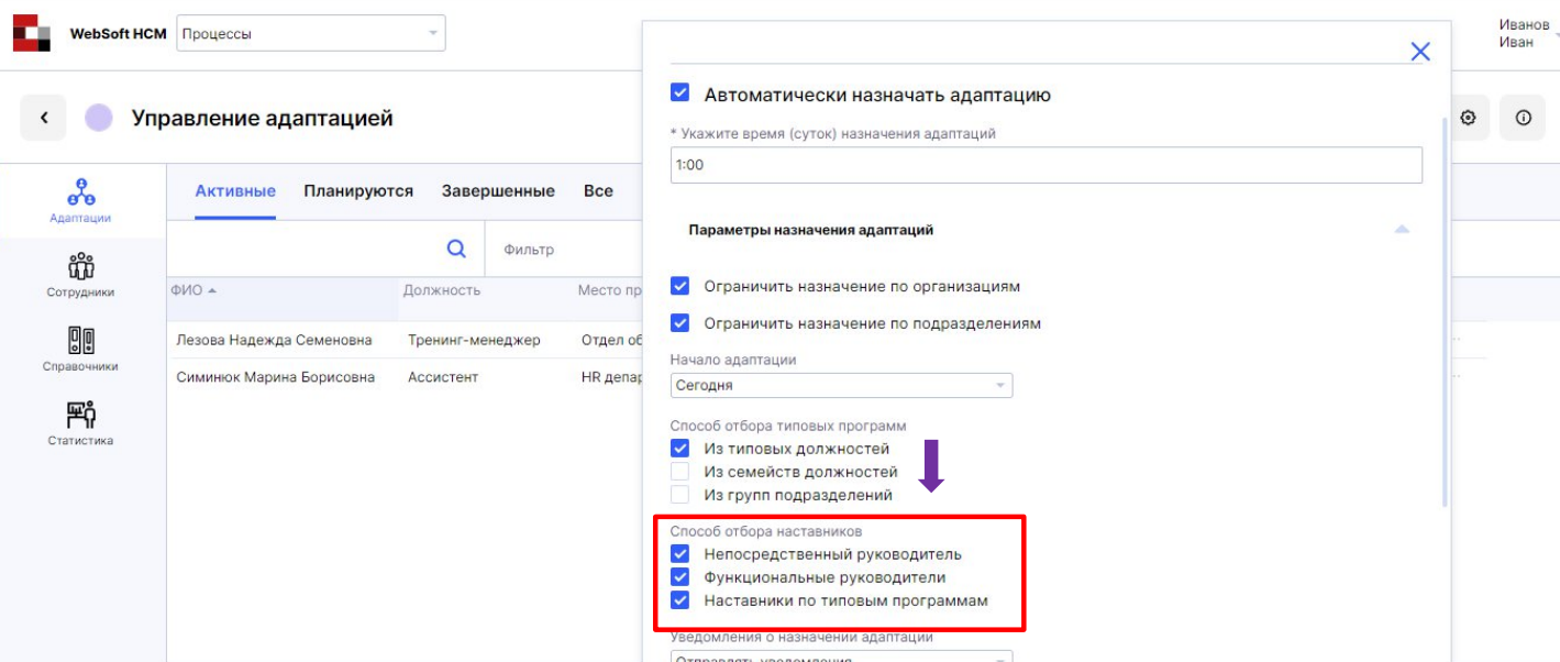 Администратору системы выбрать наставника очень просто — достаточно отметить нужные чек-боксы.