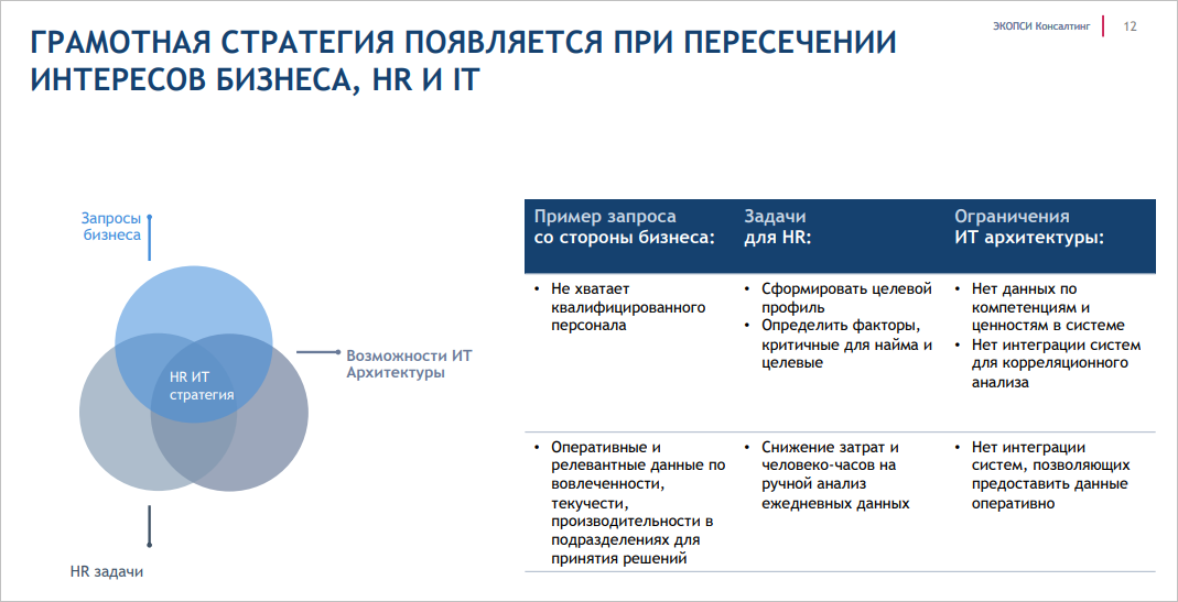 При проработке HR-IT-стратегии необходимо учитывать интересы всех сторон, поскольку для бизнеса, HR и IT одна и та же задача выглядит абсолютно по-разному.