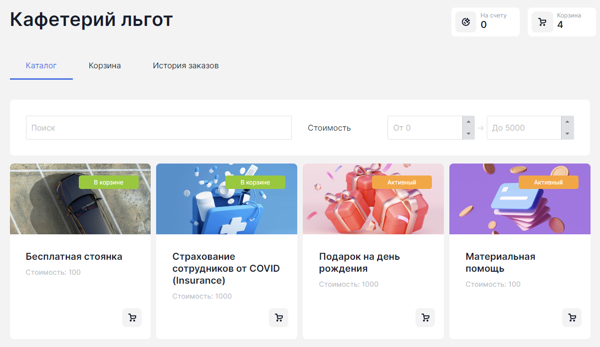 Страница кафетерия льгот сделана по принципу интернет-магазина: