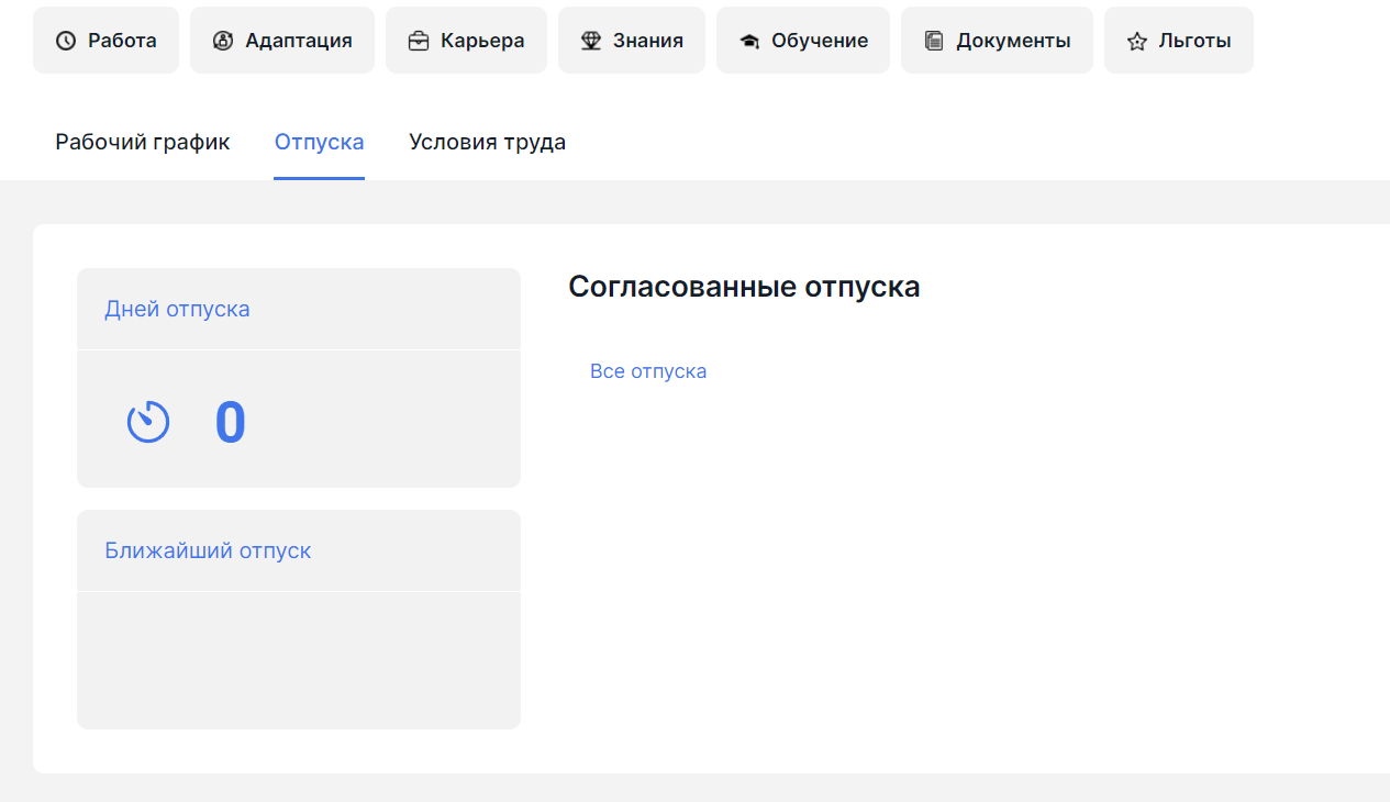 Сотрудник может запланировать и согласовать свой отпуск. Система покажет остаток дней отпуска и запланированные отпуска.