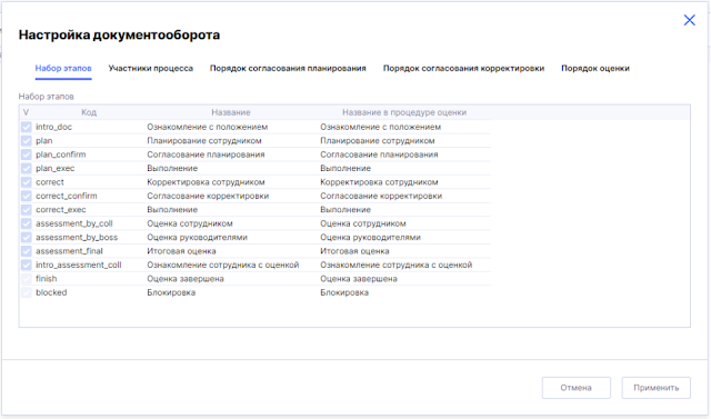- Управление оценкой MBO — настройка формата и количества целей, настройка шкал, настройка внешнего вида формы
