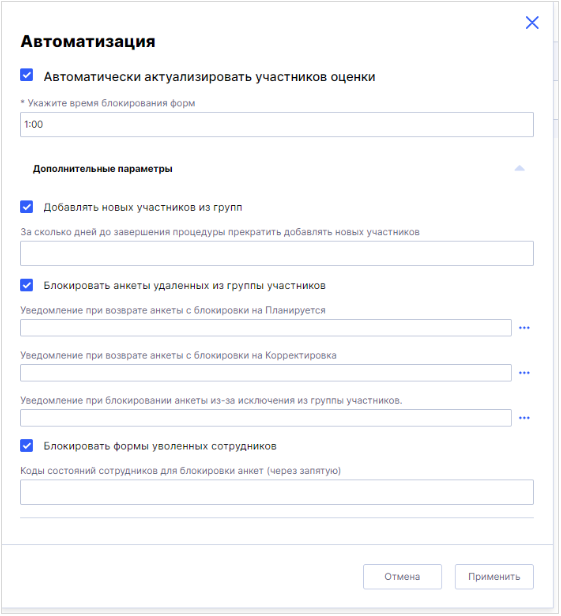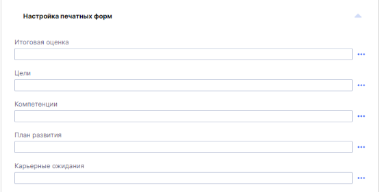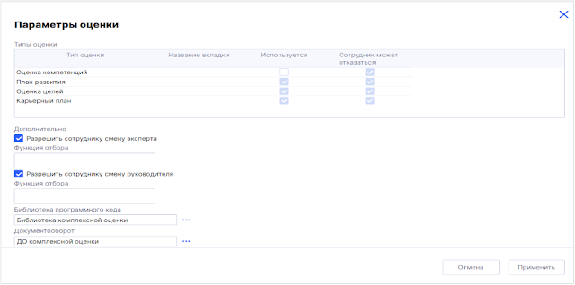 - Управление компетенциями — привязка профиля компетенций, настройки способа оценки, внешний вид формы и другие