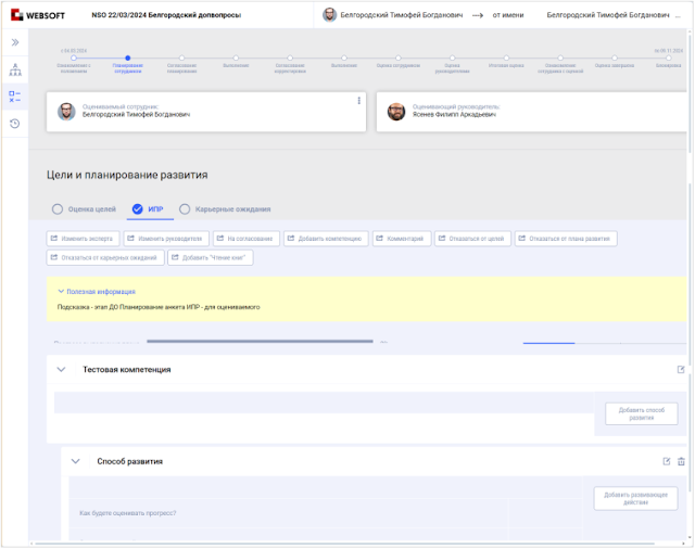- Управление ИПР — привязка профиля компетенций, заполнение способов развития, типов задач, настройка шкал оценки и другие
