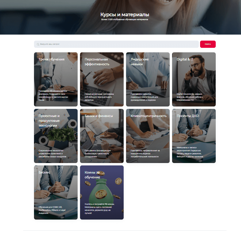 2. Запустили MVP в 2021 году: разместили на портале карточки электронных курсов банка, тесты, разработанные и прошедшие модерацию внешние видео, курсы и статьи, ссылки на книги. Запустили пилот и по его итогам приняли решение развивать портал дальше.