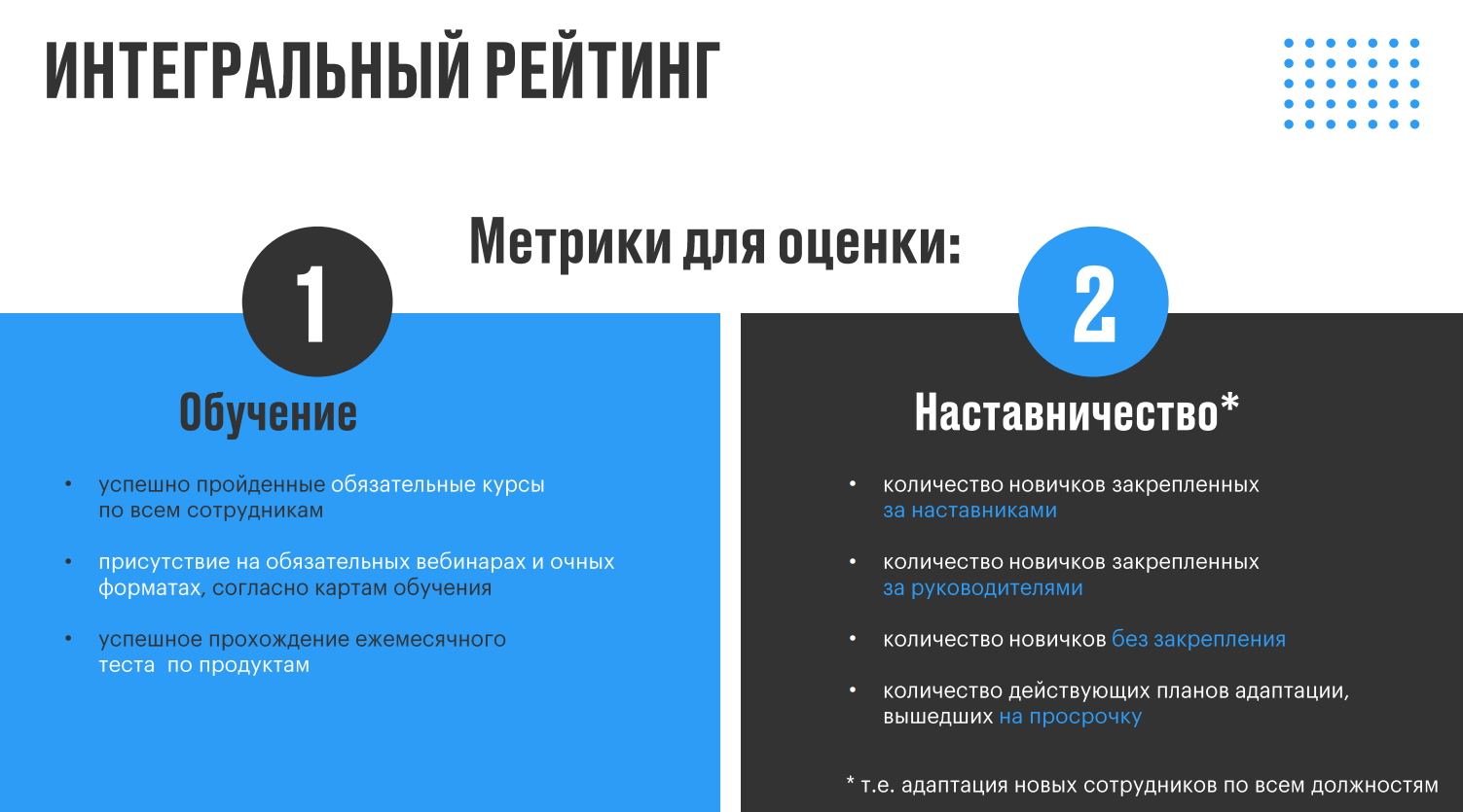 - Повышение качества завершения обязательных учебных мероприятий за счёт вовлечённости управляющих при разборах интегрального рейтинга.