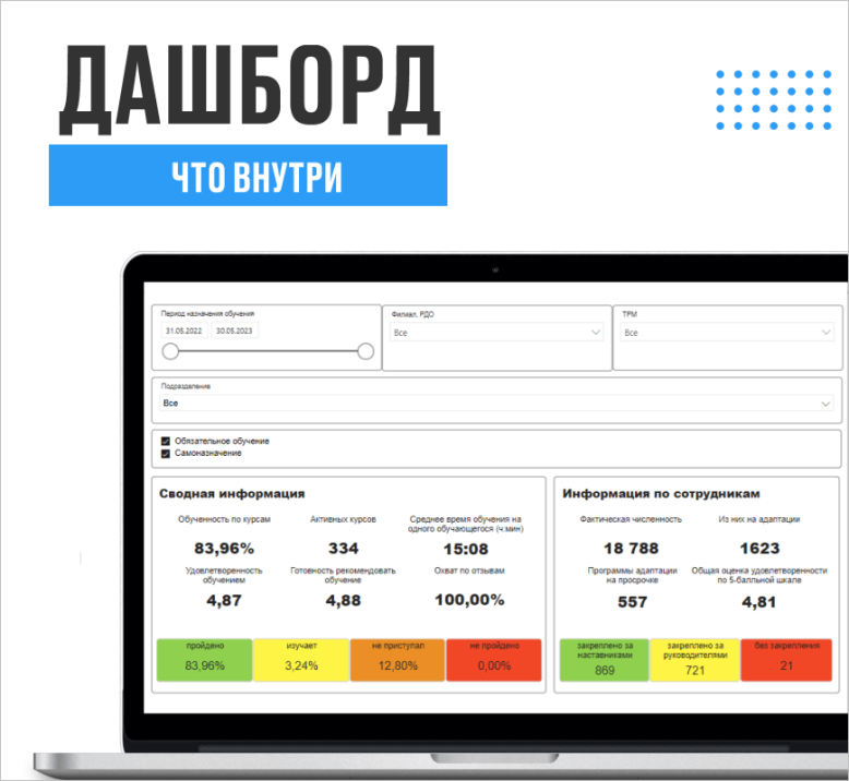 Он позволяет отразить полную картину по обучению и адаптации в режиме реального времени — как по обязательному, так и по назначенному самостоятельно, по всем сотрудникам и подразделениям компании.