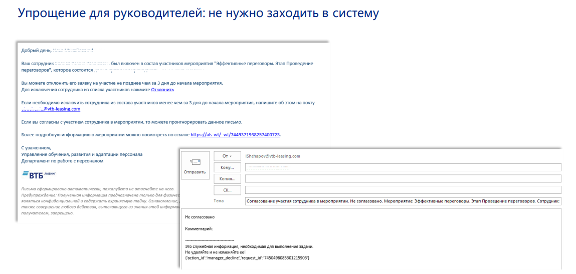Руководитель в письме может подтвердить или отклонить обучение сотрудника, и его ответ уходит в систему.