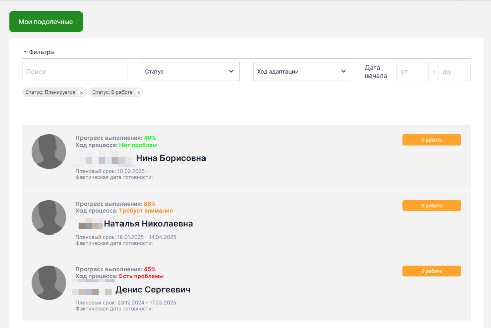 1) Мы сделали настраиваемый отчет на платформе, в котором автоматически собирается информация о ходе адаптации. Здесь можно посмотреть дату приема, дату назначения адаптации, процент готовности, дату планируемой и фактической готовности, дату увольнения в период адаптации.