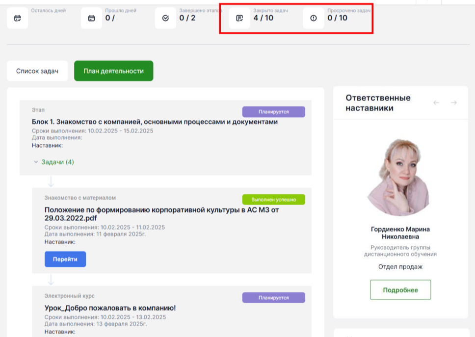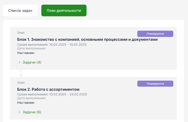 Как только адаптация назначается, новичок на своей странице видит всю информацию — список задач, общий план деятельности, что необходимо изучить. Вся программа теперь прозрачна.