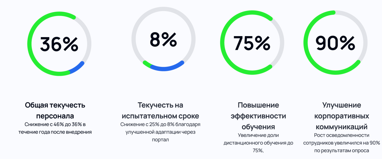 - За 12 месяцев после внедрения портала текучесть снизилась с 46 до 36%.