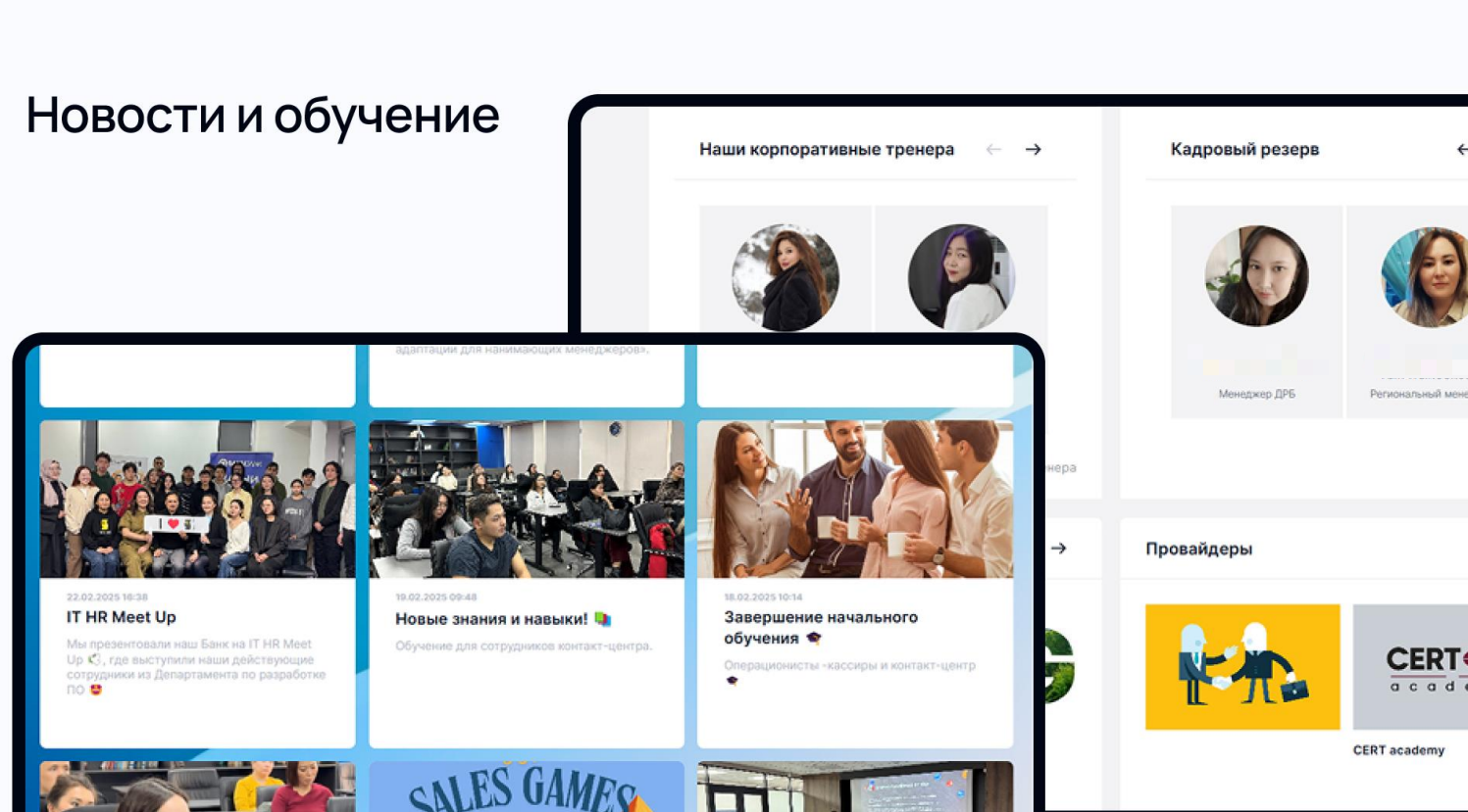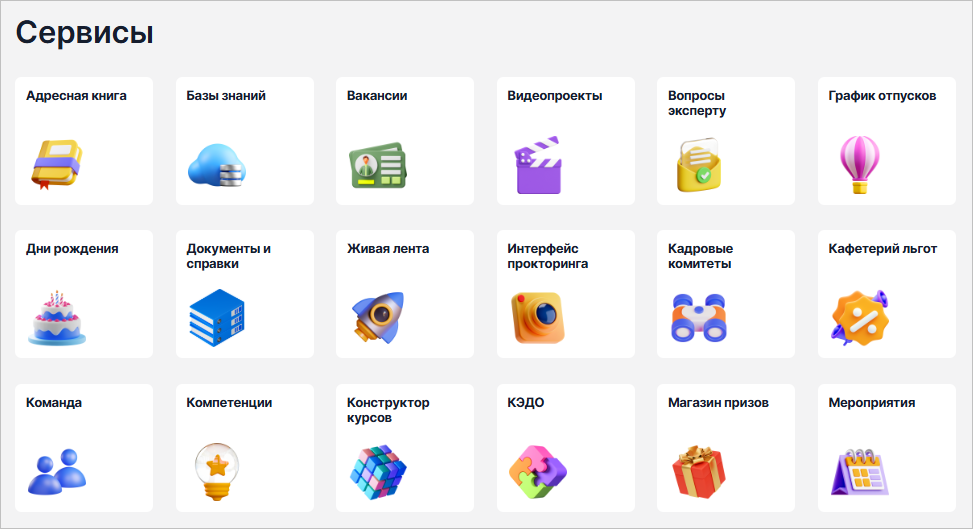 - обучение — каталог электронных курсов, карточки корпоративных тренеров, информация по провайдерам обучения