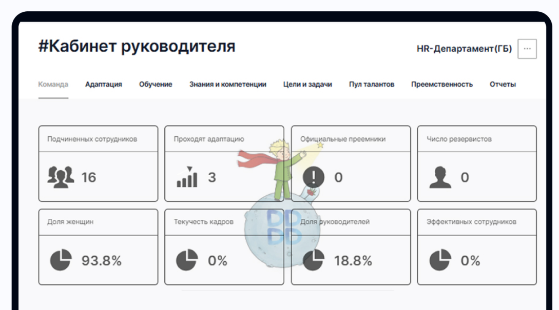 Руководитель видит карточки по всем своим подчиненным, может оперативно отслеживать адаптацию новых сотрудников, их показатели эффективности, текучесть по своему подразделению, данные по кадровому резерву.