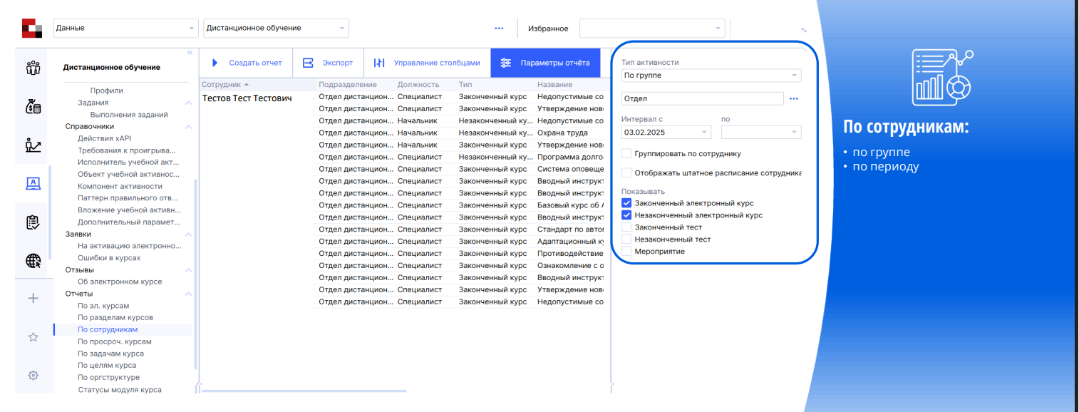 - Курсы и тесты назначаются в зависимости от должности и подразделения