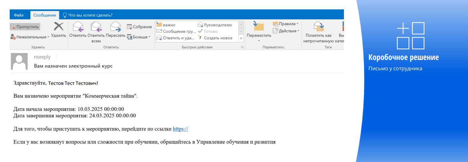 Для нас было важно включить в уведомление все основные параметры: дату начала обучения, дату завершения, ссылку на прохождение, а также обозначить, куда можно обратиться в случае возникновения вопросов.