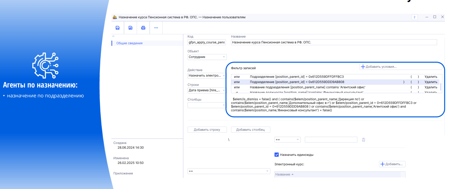 *В какой-то момент у нас изменилась организационная структура — изменились названия подразделений, должностей, добавились новые должности. Но благодаря тому, что у нас уже были настроены все условия под конкретное обучение, мы смогли оперативно скорректировать прописанные агенты.