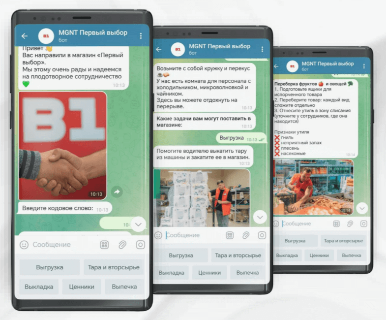 Для обучения внешних сотрудников применили несколько иной подход — разработали телеграм-бот. Он содержит основную информацию, отличительные особенности технологии работы в формате «хард-дискаунтер»: