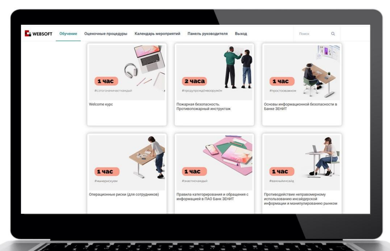 - Интерфейс портала для сотрудников стал более удобным. Они теперь назначают себе открытые курсы, выгружают отчёты, записываются на мероприятия, делятся отзывами.